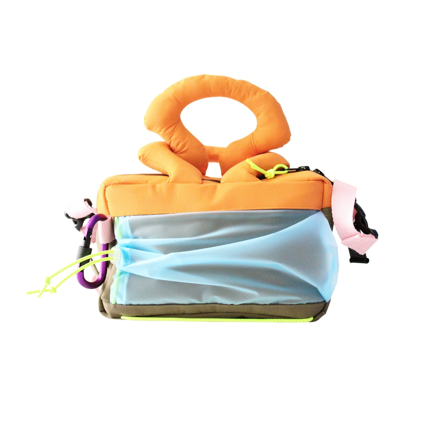 ALT Afida is an omega double wrist handbag. It is made of waterproof fabrics. An external front pocket for bottle in transparent fabrics waterproof neoprene bag opening zip / Rolled plastic clip-on pocket on the back an inside pocket protected by a self-locking double-slider neoprene zip. The independent shoulder strap is adjustable on both sides and has 2 topstitching. double hook clips with elastic. interior zipped pocket