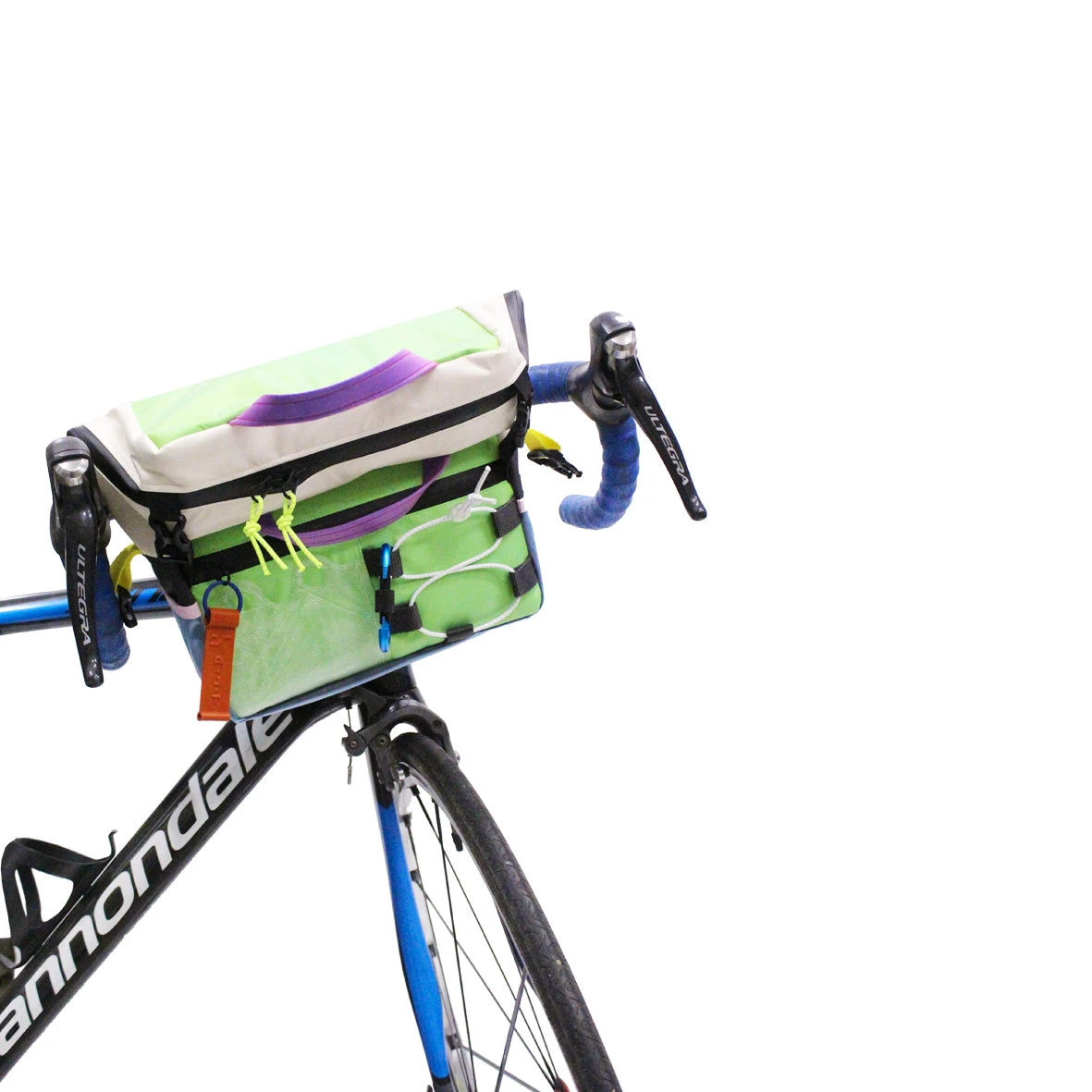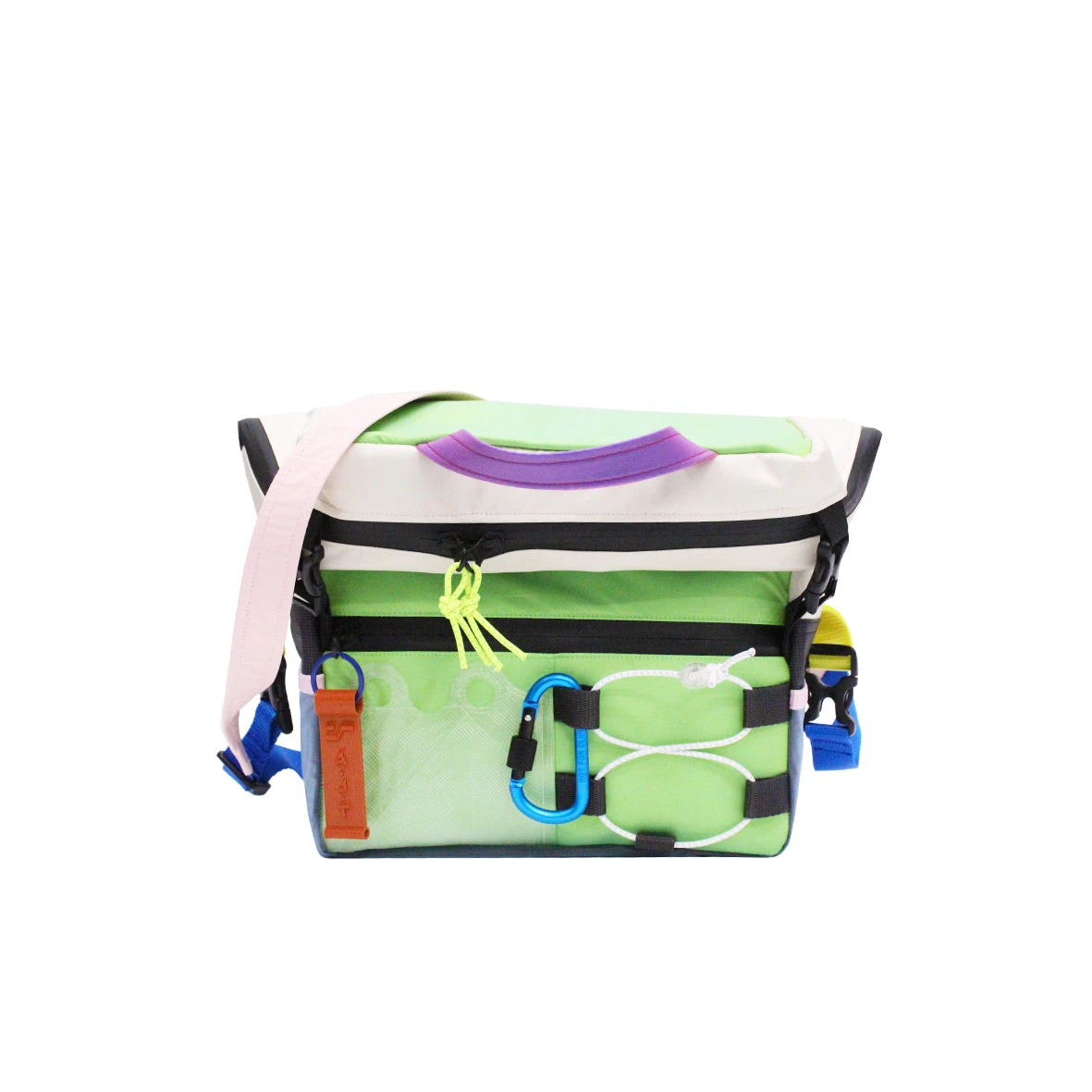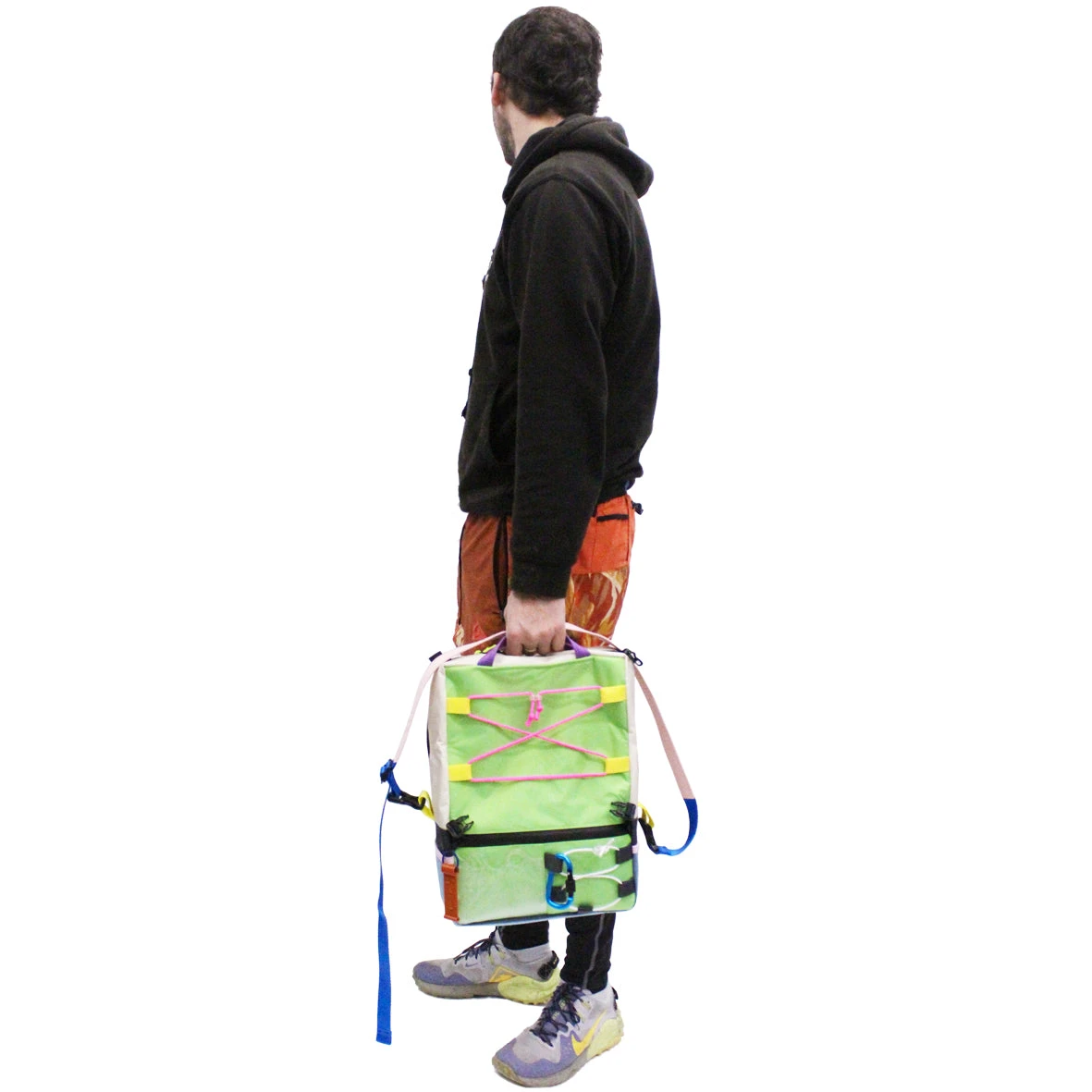 Alt Cross over Waterproof backpack is a modular bag that transforms into a backpack, messenger bag, bike bag. 2 exterior side pockets – exterior central front pocket – 3D printed card pocket – elastic lacing at the front. 1 interior patch pocket. Strap strap that can be used for carrying across the body or backpack. handle for carrying. Zipped back pocket. Zig zag cord in front. closing clips for messenger format. Adjustable clips and fixed back strap to attach the bag to the bike handlebar. ALT logo 3D printed recycled plastic & ♻️.