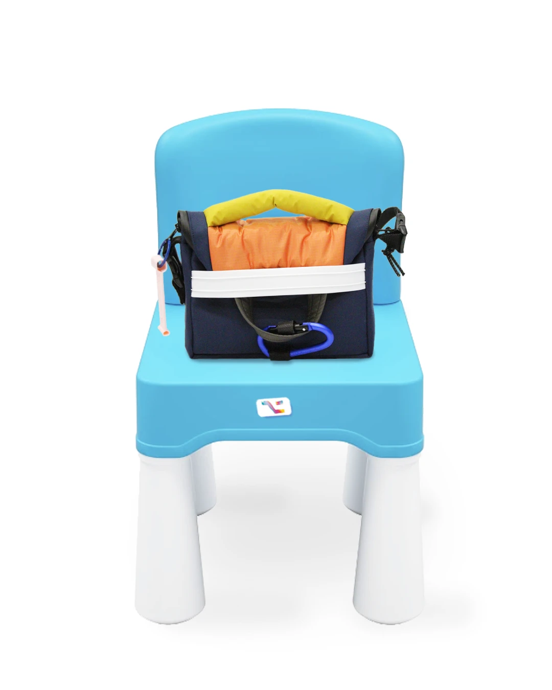 The mini Flapping is made of waterproof fabric. It has an outside zipped pocket and one inside patch pocket. The upper part is padded and has a cuddly handle. It also has two PVC-covered handles for carrying by hand. On the front, a 3D printed strip allows it to be folded in two. A loop and a removable carabiner are there to secure the opening during transport. adjustable soulderstrap