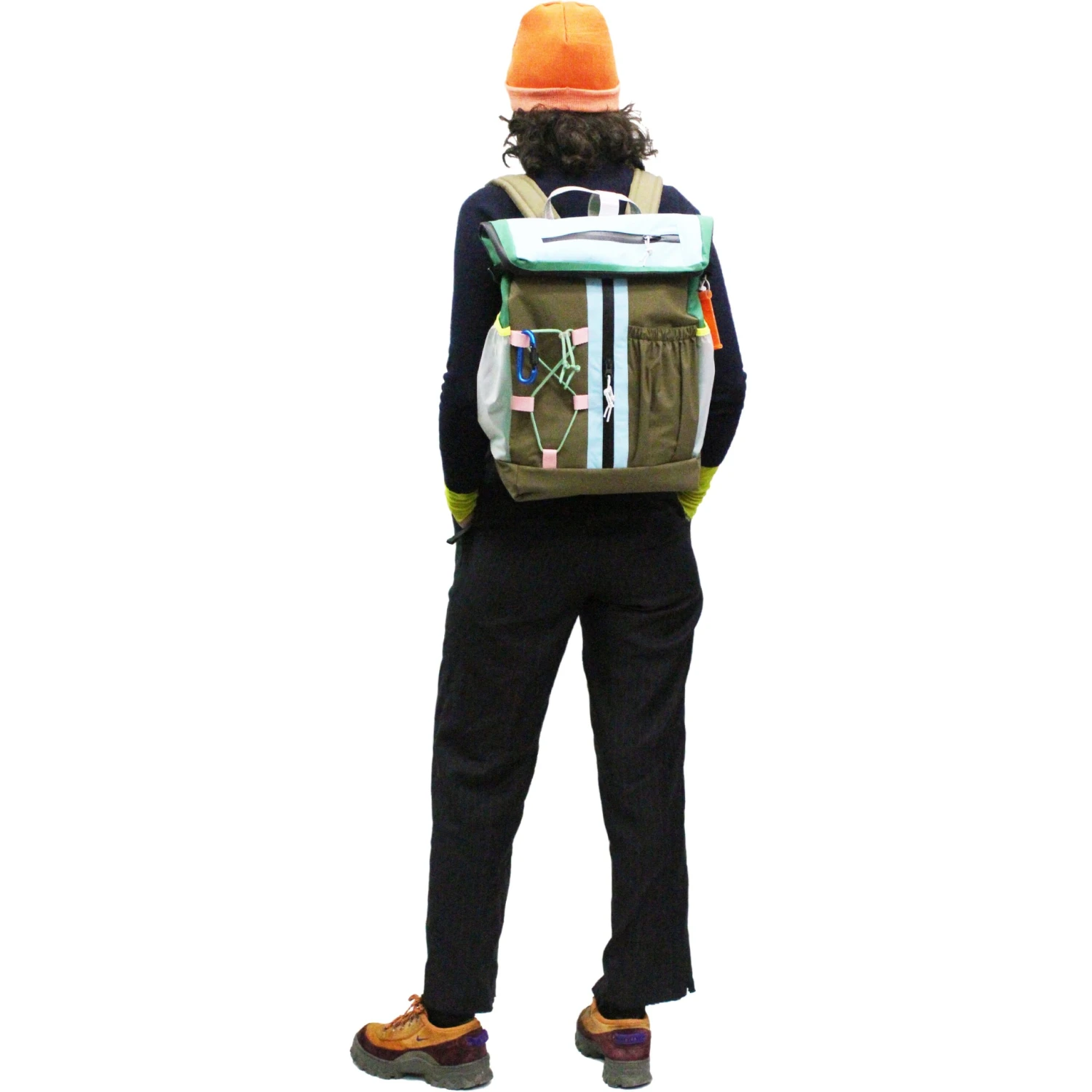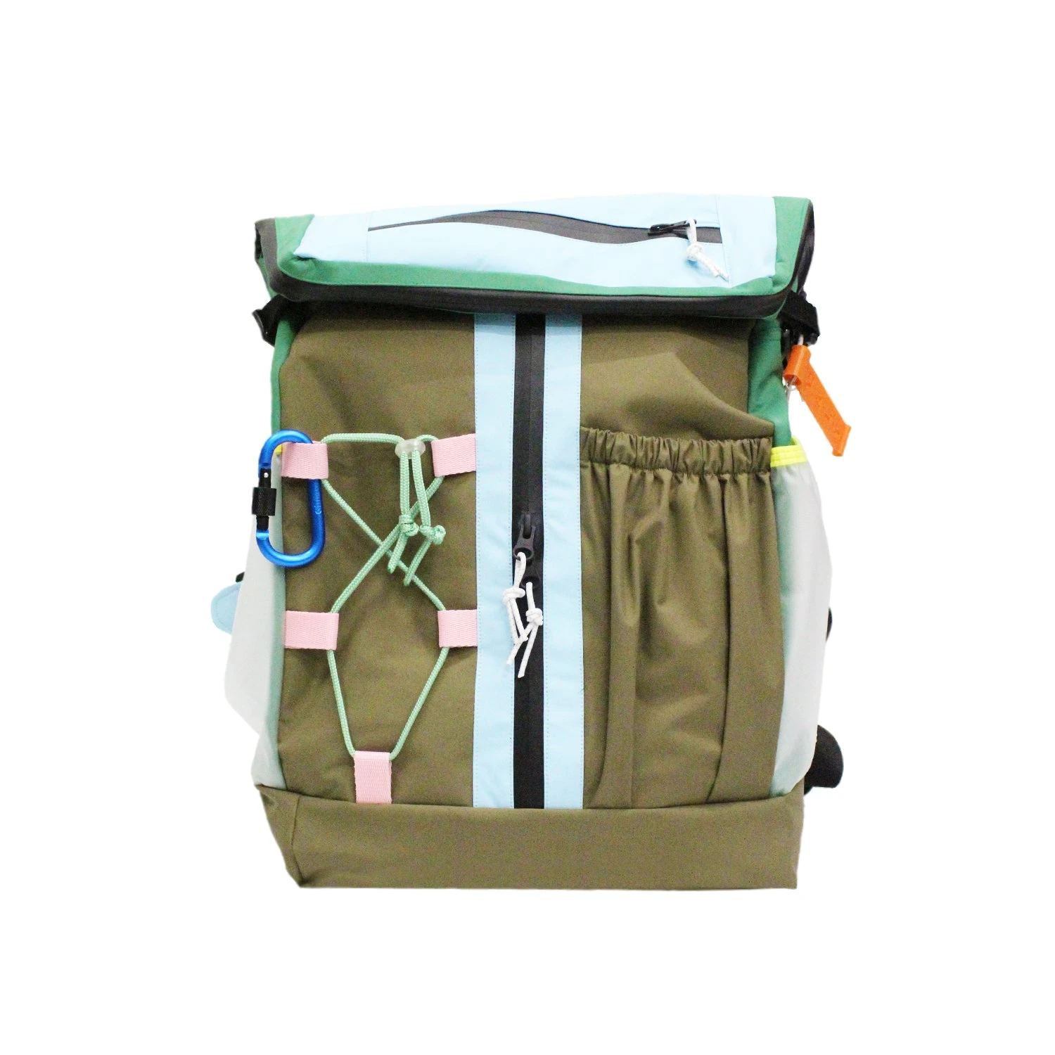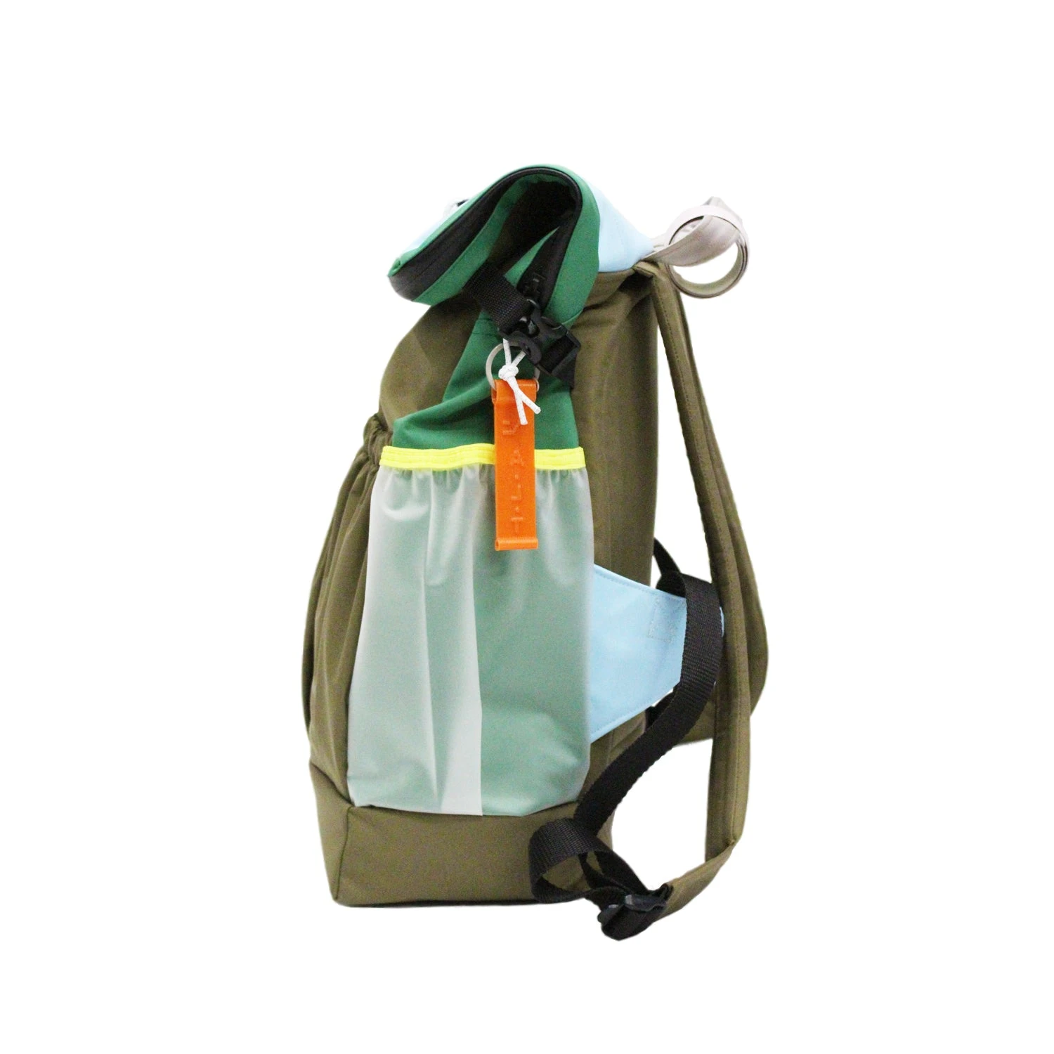 Foldable T8 backpack. waterproof fabric. 2 external elasticated side pockets.