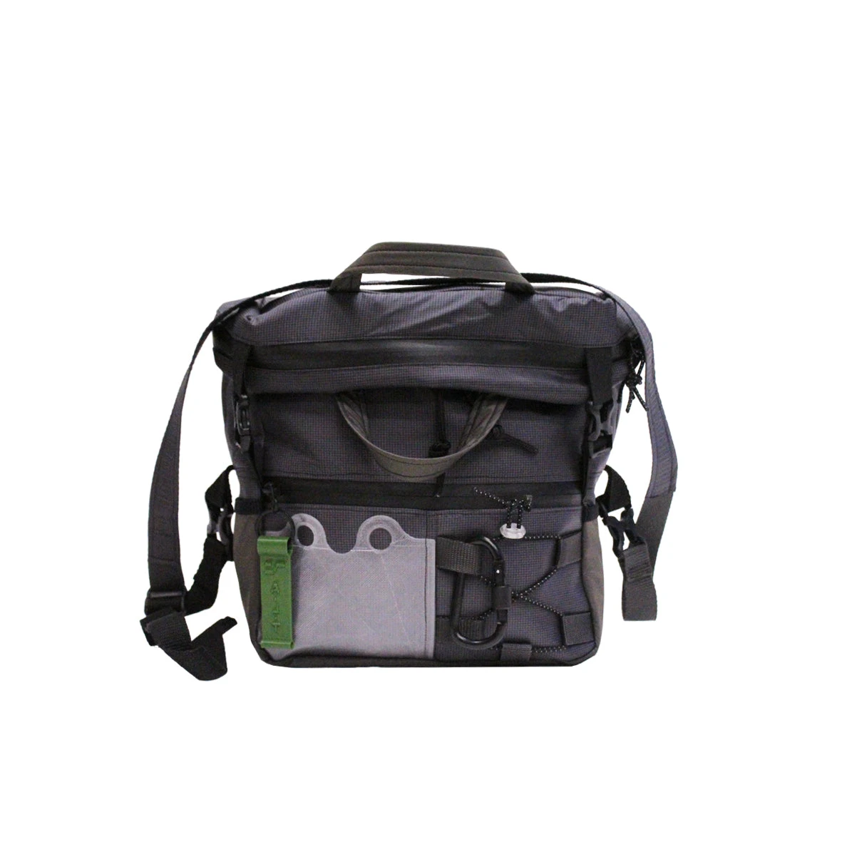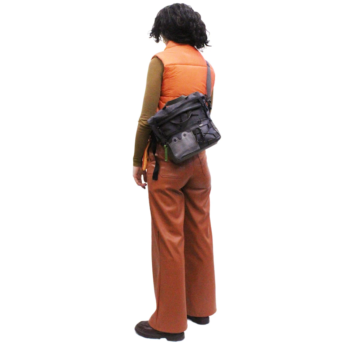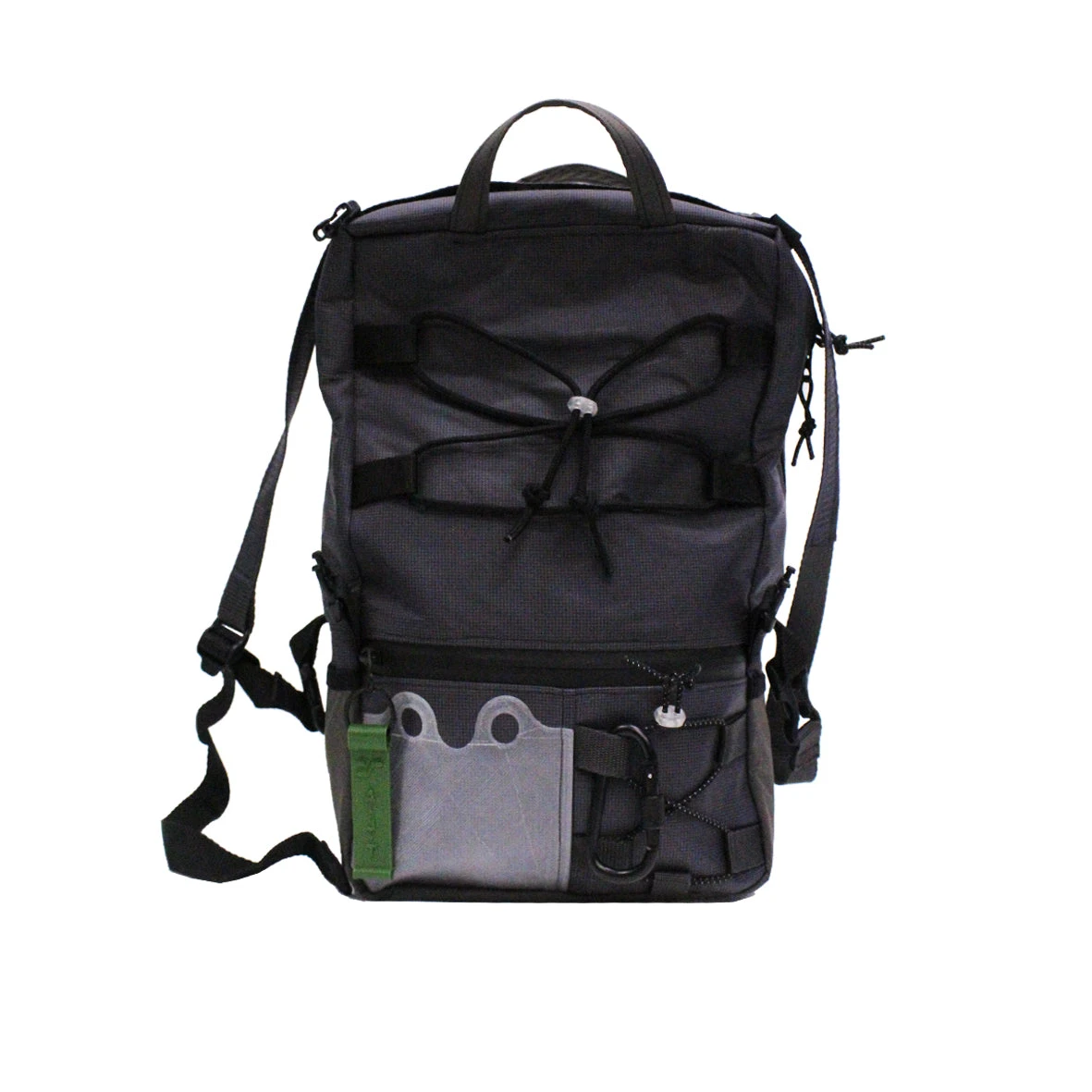 Alt Cross over Waterproof backpack is a modular bag that transforms into a backpack, messenger bag, bike bag. 2 exterior side pockets – exterior central front pocket – 3D printed card pocket – elastic lacing at the front. 1 interior patch pocket. Strap strap that can be used for carrying across the body or backpack. handle for carrying. Zipped back pocket. Zig zag cord in front. closing clips for messenger format. Adjustable clips and fixed back strap to attach the bag to the bike handlebar. ALT logo 3D printed recycled plastic & ♻️.