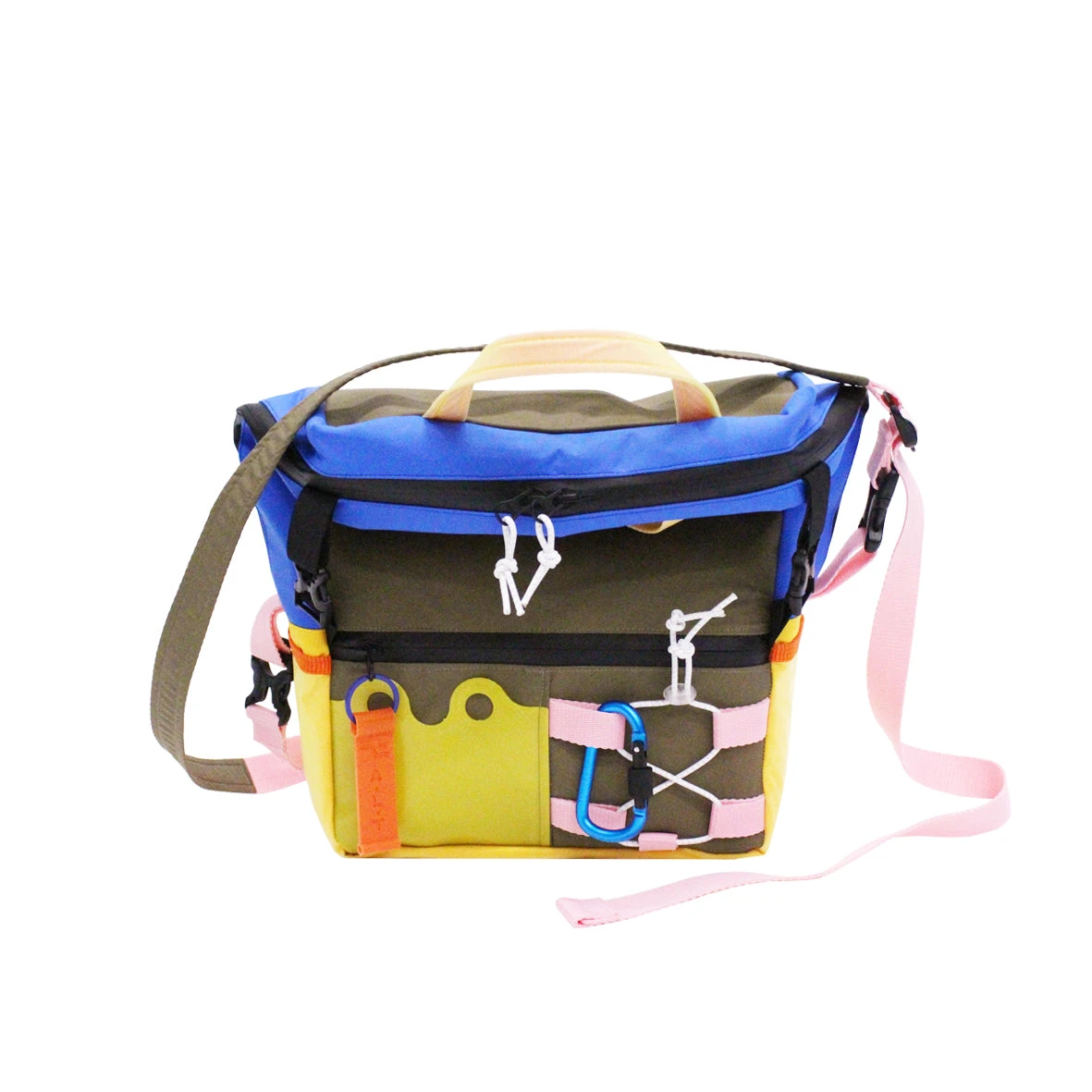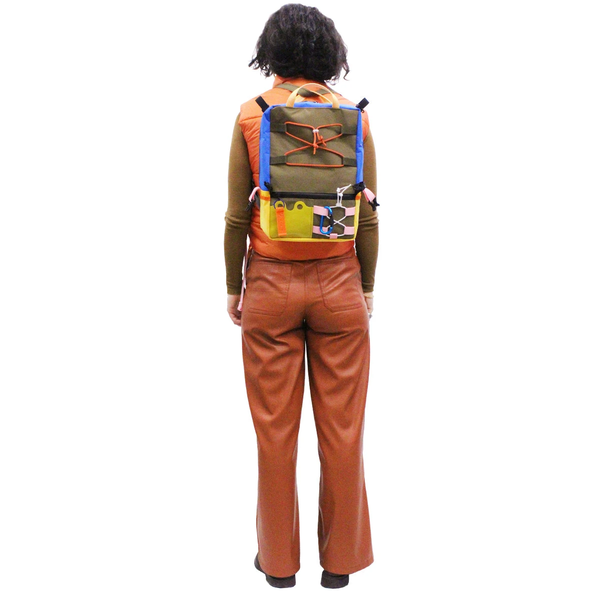Alt Cross over Waterproof backpack is a modular bag that transforms into a backpack, messenger bag, bike bag. 2 exterior side pockets – exterior central front pocket – 3D printed card pocket – elastic lacing at the front. 1 interior patch pocket. Strap strap that can be used for carrying across the body or backpack. handle for carrying. Zipped back pocket. Zig zag cord in front. closing clips for messenger format. Adjustable clips and fixed back strap to attach the bag to the bike handlebar. ALT logo 3D printed recycled plastic & ♻️.