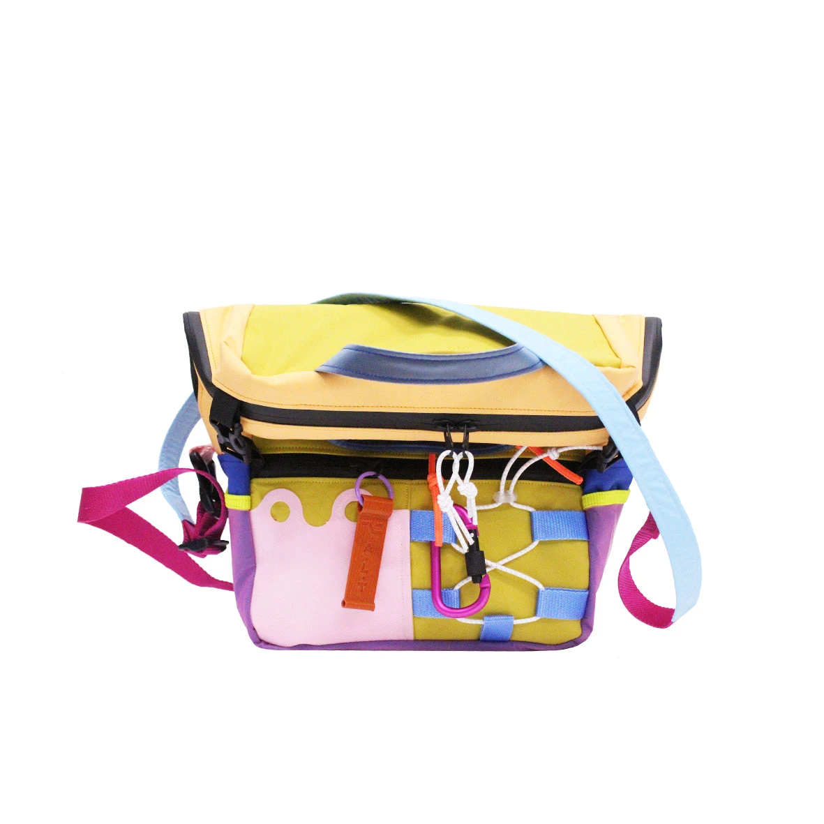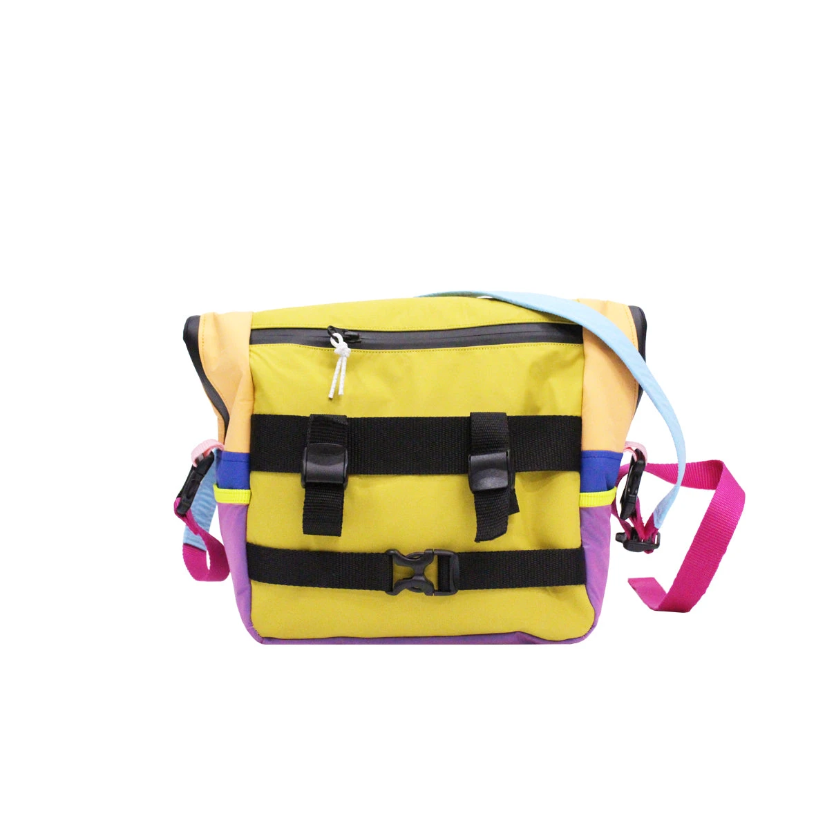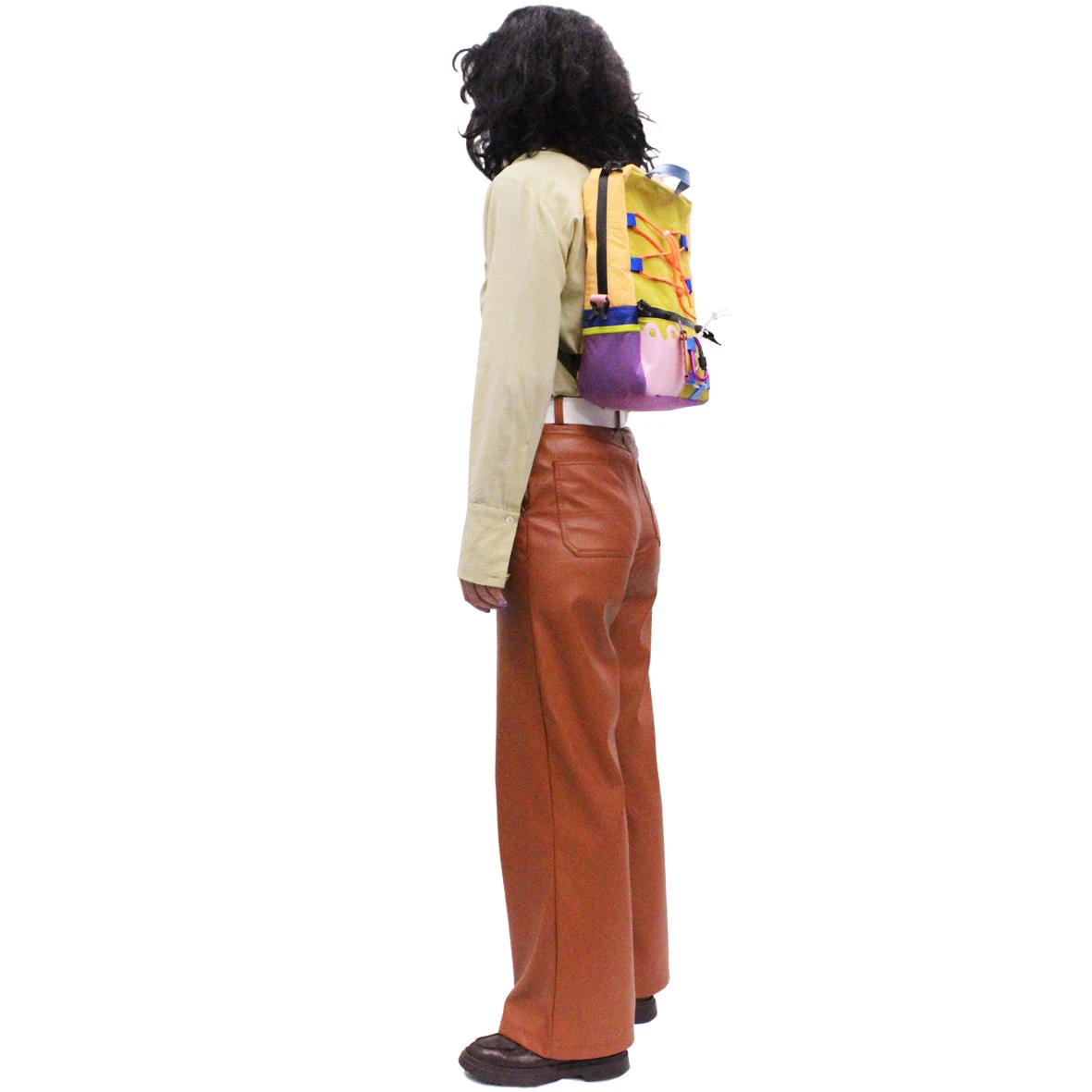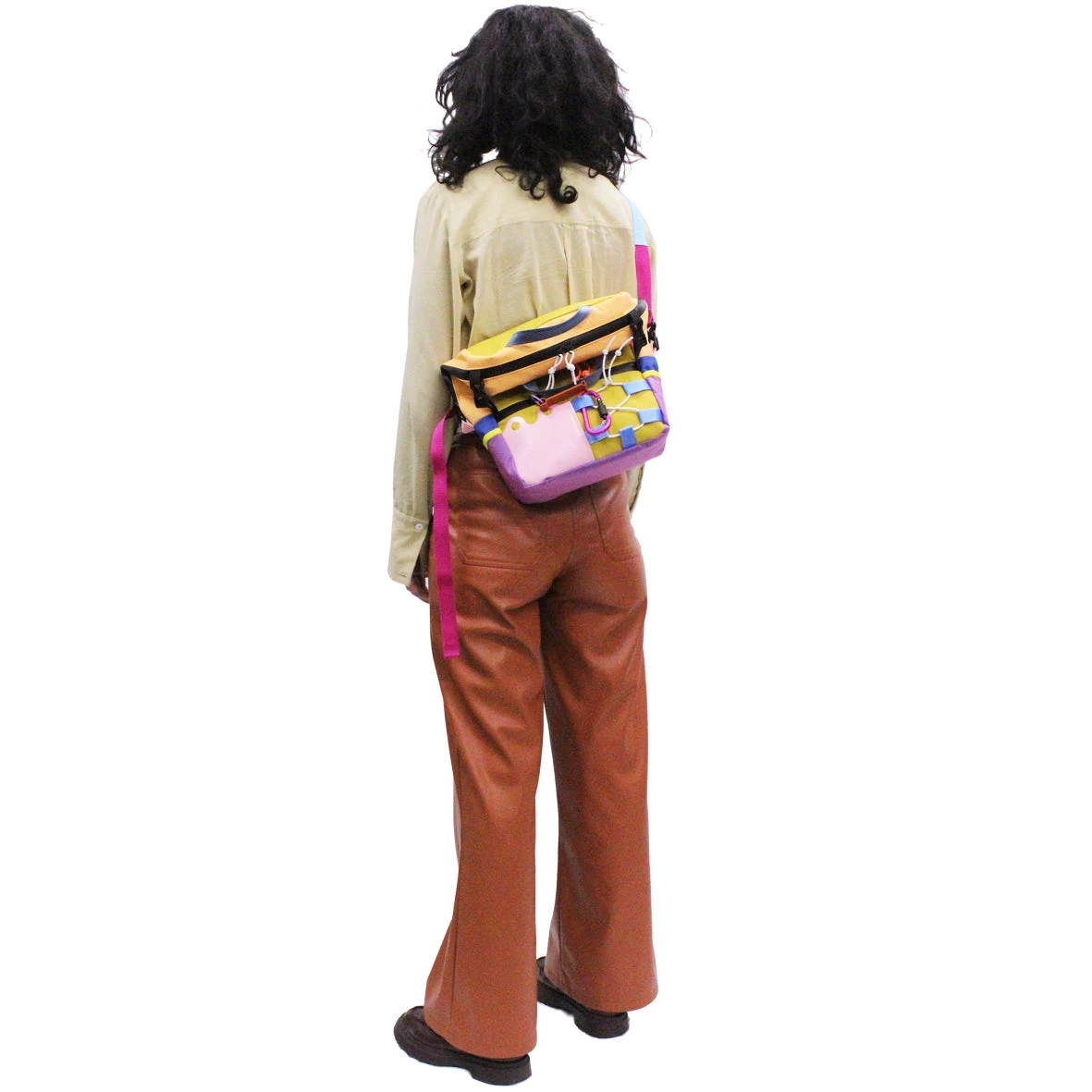 Alt Cross over Waterproof backpack is a modular bag that transforms into a backpack, messenger bag, bike bag. 2 exterior side pockets – exterior central front pocket – 3D printed card pocket – elastic lacing at the front. 1 interior patch pocket. Strap strap that can be used for carrying across the body or backpack. handle for carrying. Zipped back pocket. Zig zag cord in front. closing clips for messenger format. Adjustable clips and fixed back strap to attach the bag to the bike handlebar. ALT logo 3D printed recycled plastic & ♻️.