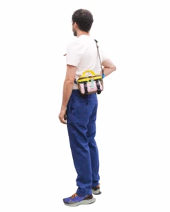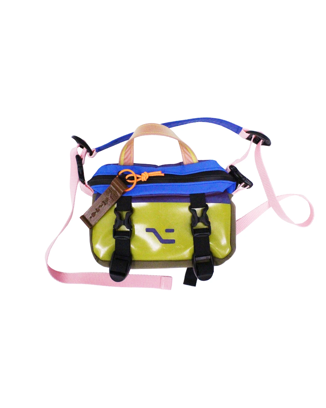 Alt mini Cross over Waterproof is a foldable bag. it has a large interior compartment to put a book; with a patch pocket. Exterior: 3D print logo folder pocket + back pocket with zip. elastic clips to fold it. Two adjustable elastic straps to put on an umbrella or a water bottle. PVC covered handle. Removable and adjustable shoulder strap. ALT logo 3D printed recycled plastic & ♻️