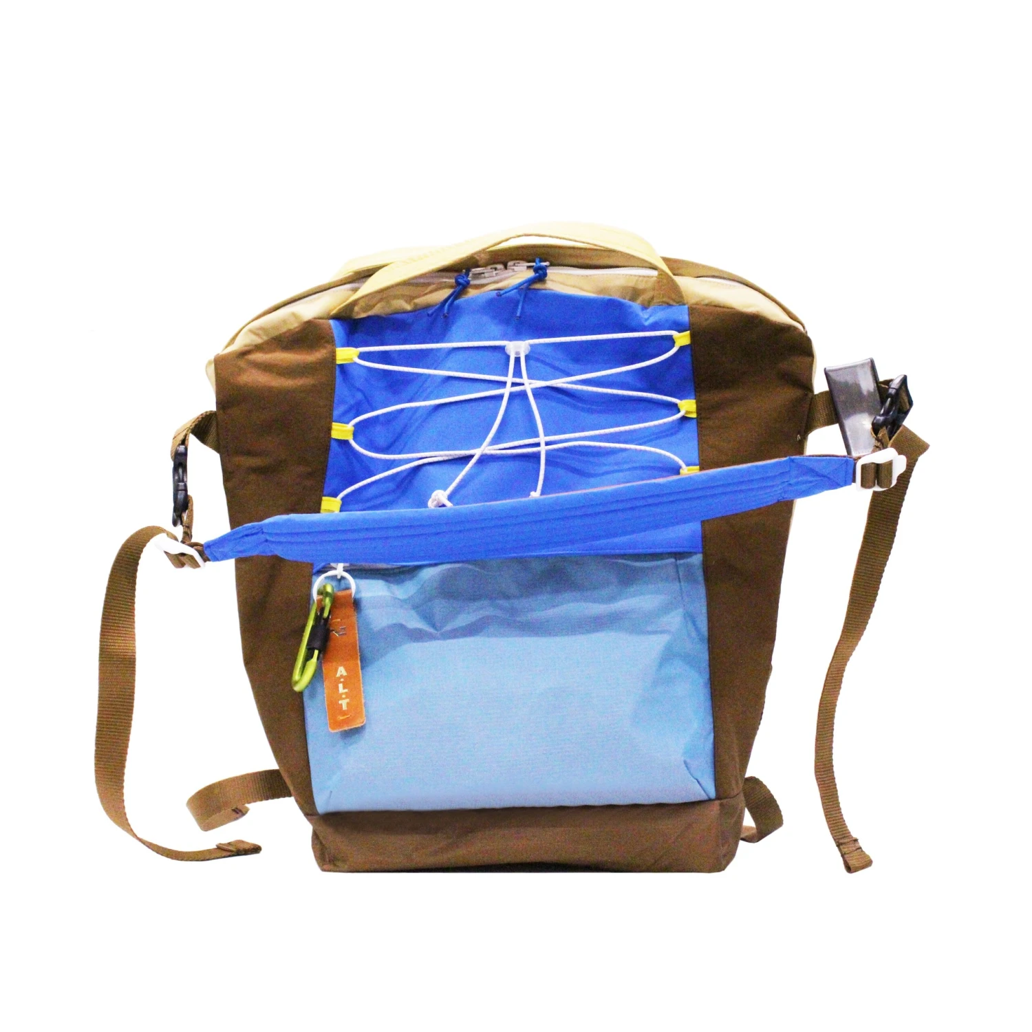 Alt X is a modular sports bag made of waterproof fabric. It has removable suspender that allow it to be transformed as needed: backpack, handbag, shoulder bag. Hight density foam & removable one on the bottom. in the back Its adjustable volume allows you to carry whatever you want with either. ALT X has two exterior pockets (one hide) and three inside pockets: central pocket (very large), pocket for keys or wallet & computer pocket. Capacity 13-17L