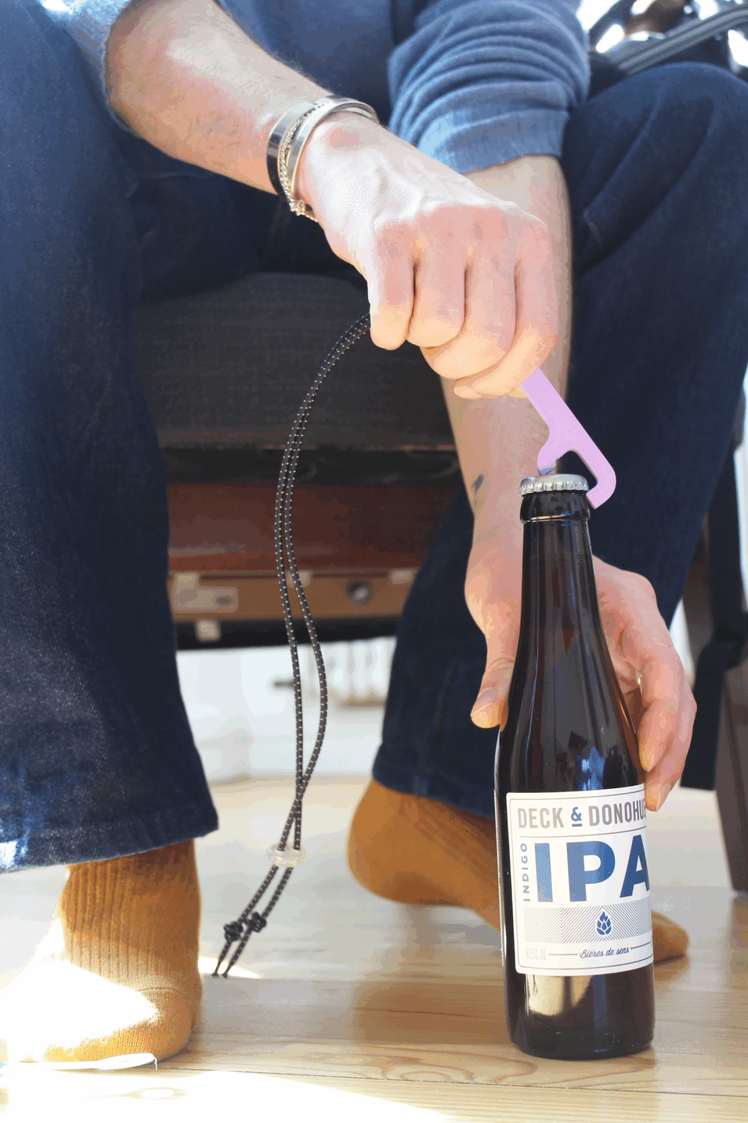 décapsuleur impression 3D avec cordon élastique réfléchissant amovible.