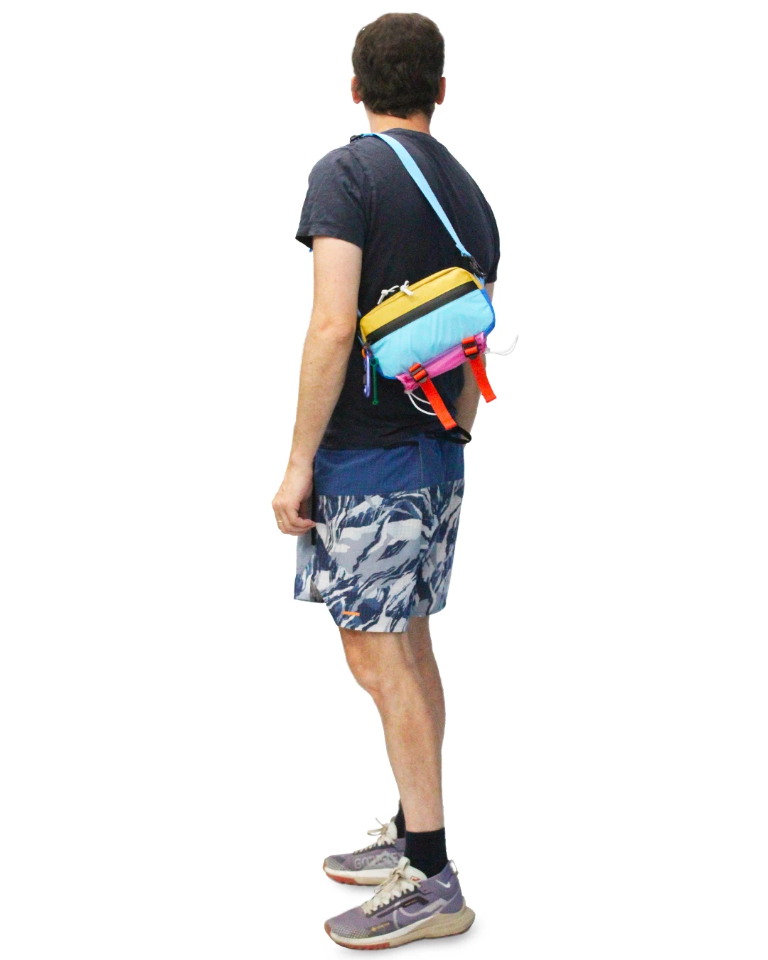 Small rectangular bag with rounded corners, waterproof, can be worn at the waist or over the shoulder.- zipped exterior pocket – PVC pocket for a water bottle or umbrella on the bottom – double flat strap to hold a jacket or other item. Interior: bias finish. Main opening waterproof neoprene zip -adjustable strap – 2 ways to weat it