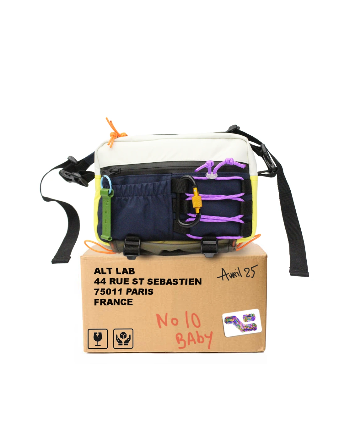 Alt No° 10 baby is a messenger bag made of waterproof fabric. It has removable suspender. One zipped outside pocket with waterproof neoprene zip/ one elastic pocket / one elastic compartment / one transparent pocket for swimwear or little umbrella.